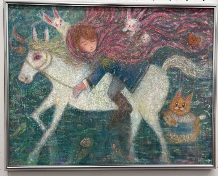 1つめの夢は、小さい頃に目にした大きな絵がある展覧会、なんてすごいんだろう。大きい絵が描いてみたいな、上野の素敵な森には素敵な美術館や博物館がいっぱいで、その中の美術館である、東京都美術館に飾ってもらえて、それも現代童画会という会のおかげで、驚いたことに、小さい頃、口に出すこともできず胸に秘めていた夢が叶っていました。